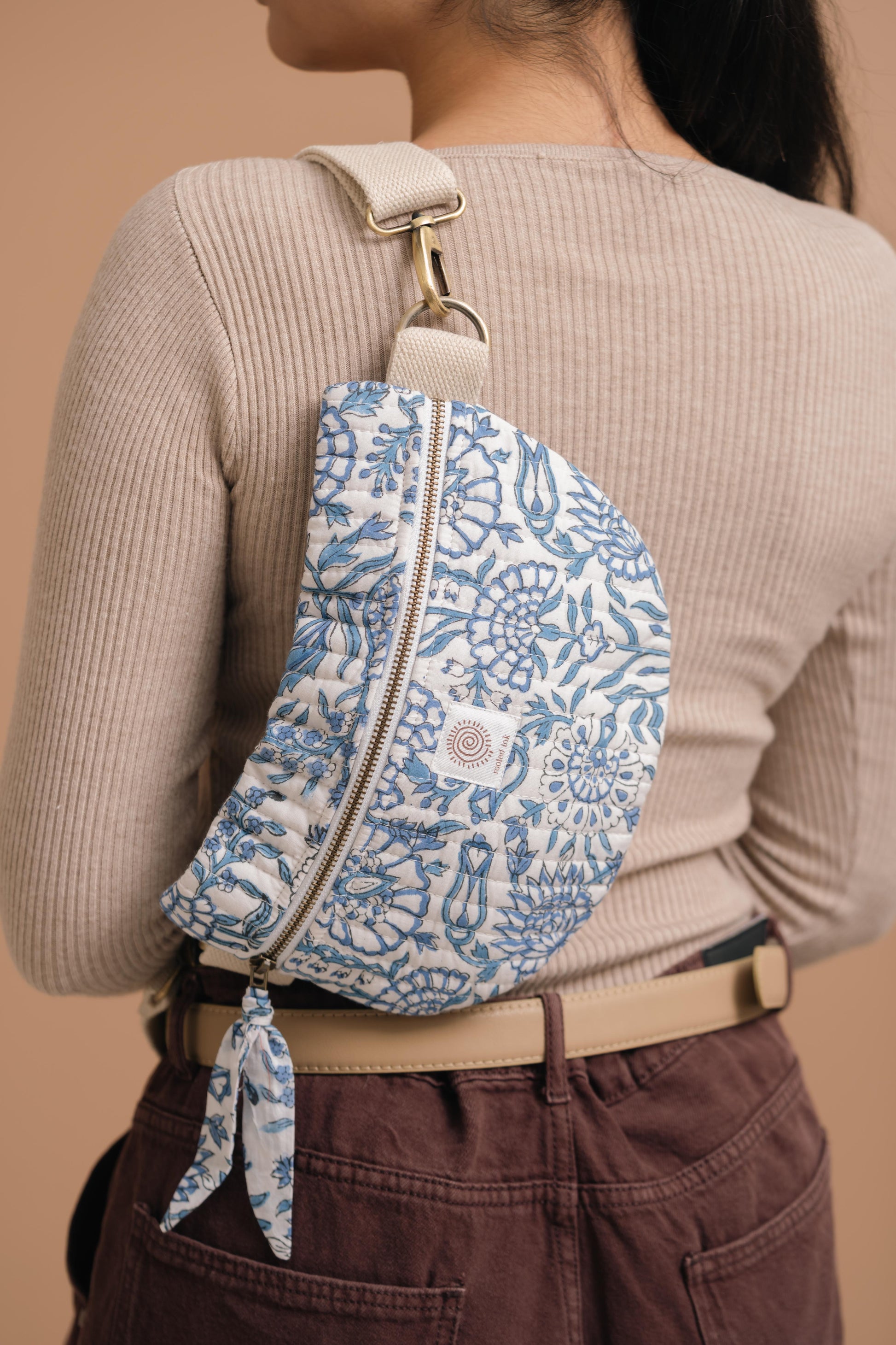 Drawing inspiration from the botanicals of India, the Indigo Marigold Fanny Pack showcases deep indigo hues and intricate floral detailing. Each piece is hand block printed on soft quilted cotton, celebrating the beauty of traditional craftsmanship.
